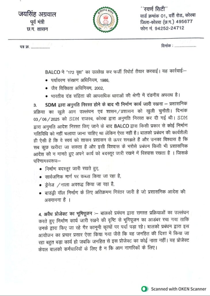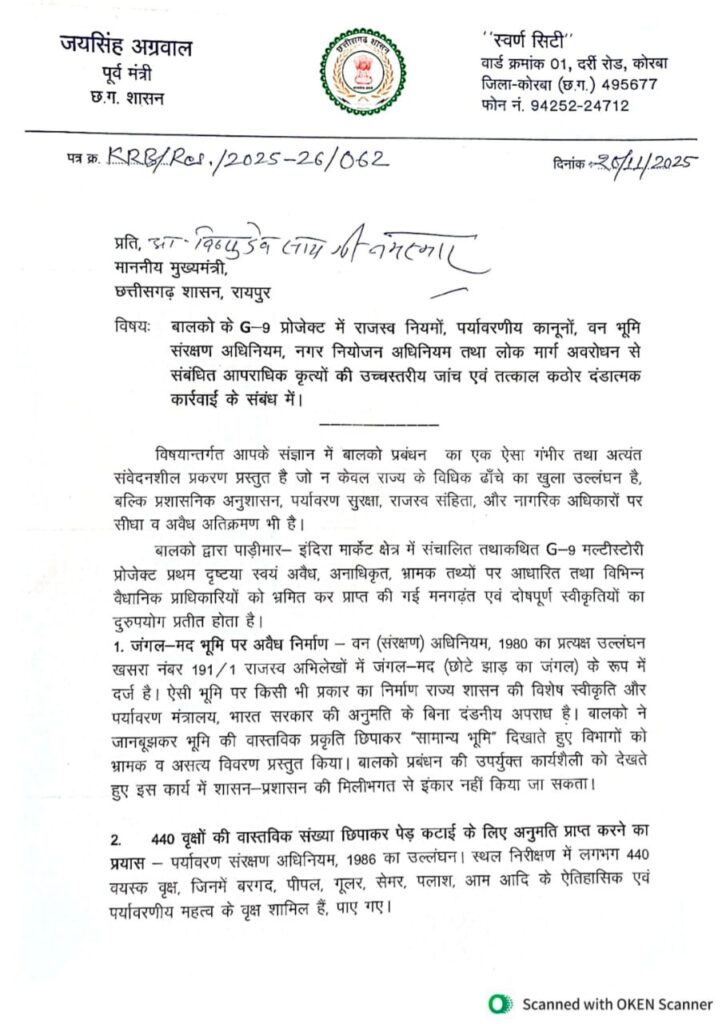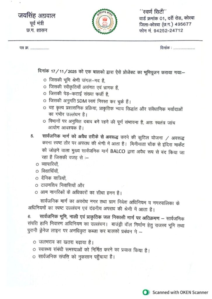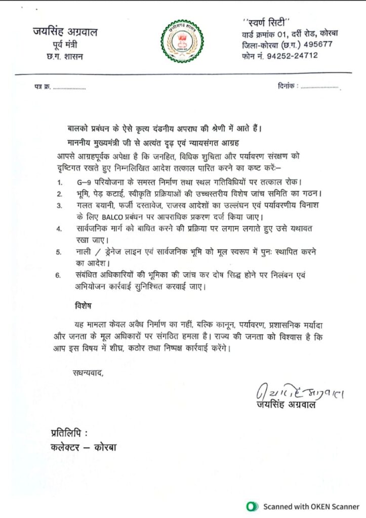 21 Nov कोरबा: BALCO के बहुचर्चित G-9 प्रोजेक्ट को लेकर गंभीर आरोप सामने आए हैं। पूर्व मंत्री जयसिंह अग्रवाल ने मुख्यमंत्री को भेजे गए एक विस्तृत पत्र में BALCO प्रबंधन पर कई गंभीर एवं आपराधिक प्रकृति के उल्लंघनों का आरोप लगाया है। पत्र में दावा किया गया है कि यह प्रोजेक्ट राजस्व, पर्यावरण, वन तथा नगर नियोजन से जुड़े कई महत्वपूर्ण कानूनों का खुला उल्लंघन कर संचालित किया जा रहा है। अग्रवाल ने इसे “कानून, पर्यावरण और नागरिक अधिकारों पर संगठित हमला” बताया है।
