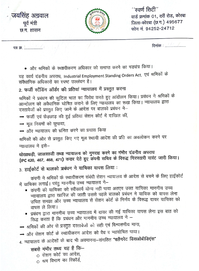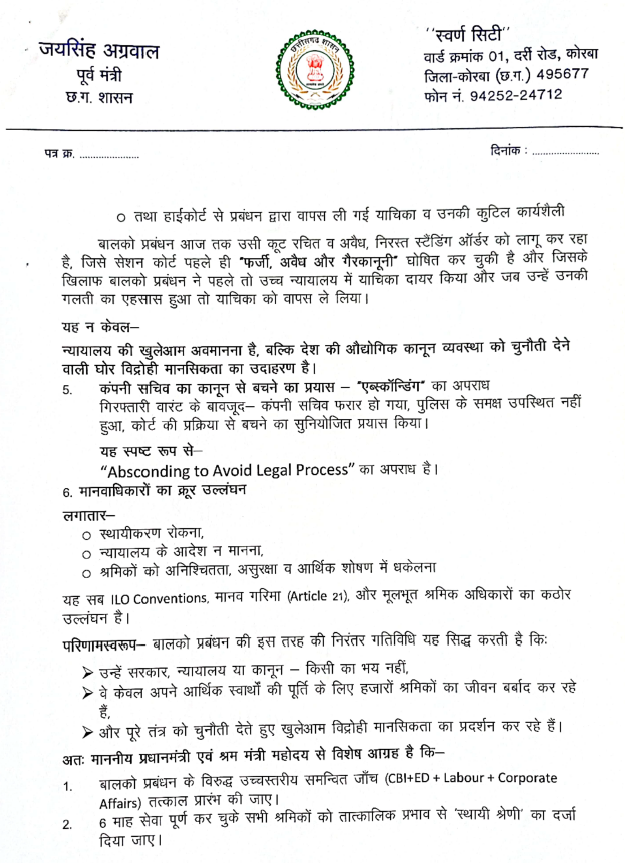 01 Dec 2025 कोरबा: पूर्व मंत्री जयसिंह अग्रवाल ने प्रधानमंत्री को लिखे पत्र में कोरबा स्थित भारत एल्यूमिनियम कंपनी (बालको) में जारी अवैध, मनमानी और जालसाजीपूर्ण गतिविधियों पर गंभीर चिंता व्यक्त की है। उन्होंने कहा कि बालको में भारत सरकार की अभी भी 49प्रतिशत हिस्सेदारी है, वहाँ जो कुछ चल रहा है वह केवल “श्रमिक शोषण” नहीं बल्कि- एक गंभीर आर्थिक अपराध, न्यायालयीय आदेशों का खुला अपमान, औद्योगिक कानूनों का खुला उल्लंघन, और श्रमिकों के मानवाधिकारों पर लगातार प्रहार है। श्री अग्रवाल ने अपने पत्र में पिछले कुछ वर्षों के उन घटनाक्रमों को विस्तार से रखा है जिनसे स्पष्ट होता है कि बालको प्रबंधन ने कानून, संवैधानिक व्यवस्था तथा न्यायपालिका को जानबूझकर हानि पहुँचाई है।