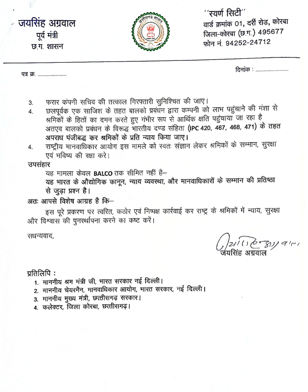 श्रमिकों के शोषण व कुटिल मानसिकता के वशीभूत बालको प्रबंधन की निरंकुश कार्यशैली पर पूर्व मंत्री जयसिंह अग्रवाल ने प्रधानमंत्री को लिखा पत्र