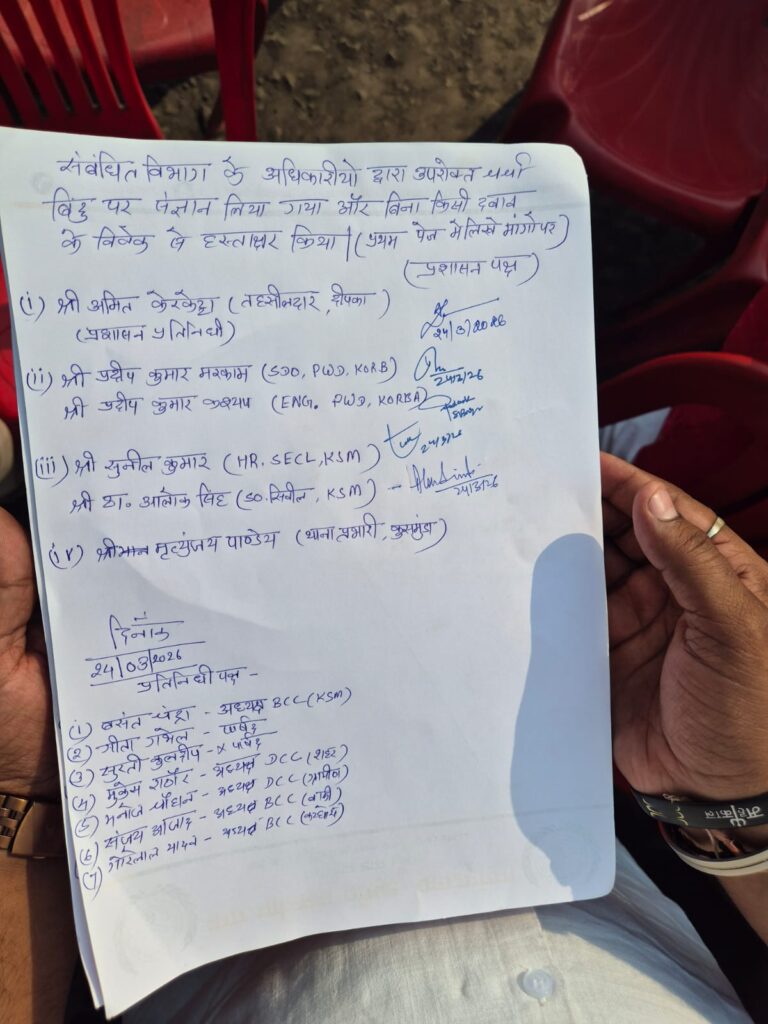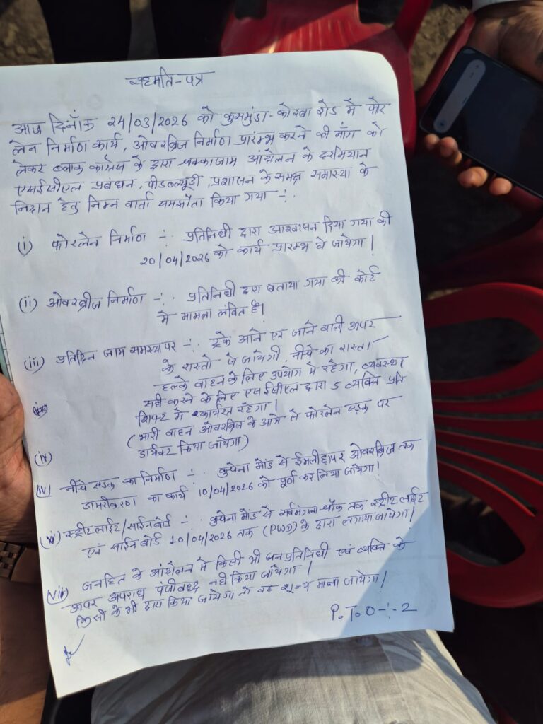 धरना प्रदर्शन के दौरान एसईसीएल प्रबंधन, पीडब्लयुडी विभाग, जिला प्रशासन एवं पुलिस प्रशासन के अधिकारियों ने निम्न विषयों पर वार्ता कर लिखित समझौता किया जिसमें 20 अप्रैल 2026 से पहले फोरलेन सड़क निर्माण प्रारंभ करा देने की बात पर हस्ताक्षर किये गये तथा ओव्हरब्रिज के निर्माण के बारे में बताया गया यह मामला न्यायालय में लंबित है जैसे ही न्यायालय का निर्णय आवेगा उसी आधार पर आगे का कार्य योजना बनाया जावेगा, इसके अलावा प्रतिदिन की जाम से राहत दिलाने के लिए भारी वाहनों को ऊपर के रास्तों से भेजा जावेगा, इसके लिए एसईसीएल प्रबंधन की ओर से पांच कर्मचारी तैनात रहेंगे । समझौता वार्ता के दौरान बताया गया कि 10 अप्रैल 2026 तक कुचैना मोड़ से ईमलीछापर ओव्हरब्रिज तक डामरीकरण का कार्य पूरा हो जावेगा, वहीं कुचैना मोड़ से सर्वमंगला चौक तक स्ट्रीट लाईट एवं साईन बोर्ड पीडब्ल्युडी विभाग द्वारा 10 अप्रैल 2026 तक लगाया जावेगा । समझौता में इस बात पर भी संज्ञान लाया गया कि यह आंदोलन जनहित के लिए जरूरी हो गया था, इसलिए किसी व्यक्ति विशेष पर अपराध दर्ज नहीं किया जावेगा । समझौता पत्र पर प्रशासन की ओर से दीपका तहसीलदार अमित केरकेट्टा, पीडब्ल्युडी के एसडीओ प्रदीप कुमार मरकाम एवं इंजीनियर प्रदीप कुमार कश्यप, कुसमुण्डा एसईसीएल के एच आर हेड सुनील कुमार एवं ठाकुर आलोक सिंह ने हस्ताक्षर किये हैं।