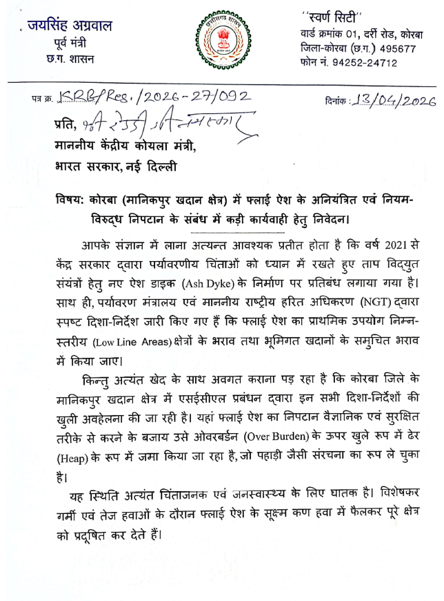 17 April 2026 कोरबा: छत्तीसगढ़ शासन के पूर्व मंत्री जयसिंह अग्रवाल ने कोरबा के मानिकपुर खदान क्षेत्र में फ्लाई ऐश के कथित अवैध और नियमों के विरुद्ध निपटान को लेकर केंद्र सरकार और एसईसीएल प्रबंधन पर तीखा हमला बोला है। उन्होंने आरोप लगाया कि सरकार पर्यावरण संरक्षण के नाम पर दिखावा कर रही है, जबकि जमीनी स्तर पर नियमों की खुलेआम अनदेखी की जा रही है।