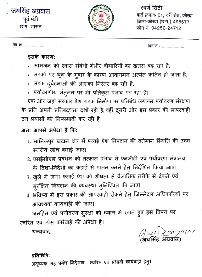 जयसिंह अग्रवाल ने मांग की है कि मानिकपुर क्षेत्र में फ्लाई ऐश निपटान की उच्च स्तरीय जांच कराई जाए, दोषी अधिकारियों पर कड़ी कार्रवाई की जाए और खुले में पड़े फ्लाई ऐश को वैज्ञानिक तरीके से ढंककर सुरक्षित निपटान सुनिश्चित किया जाए।
