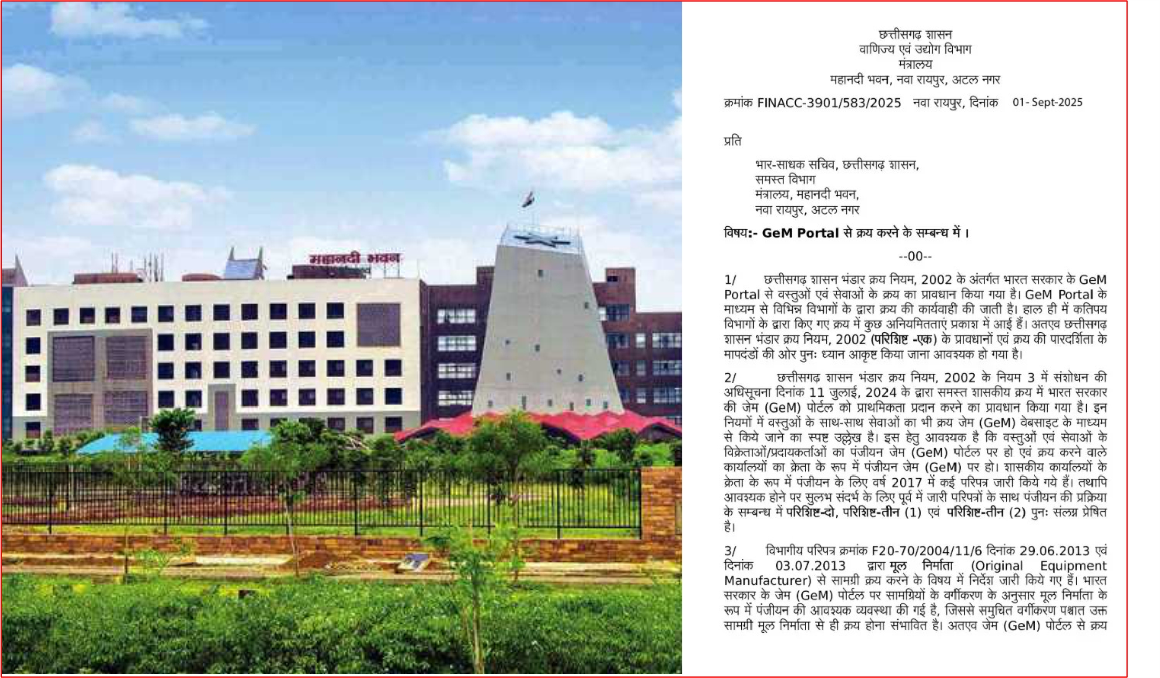 08 Sep 2025 रायपुर: छत्तीसगढ़ शासन ने शासकीय क्रय प्रक्रिया में पारदर्शिता लाने और नियमों के पालन को सुनिश्चित करने के लिए नया आदेश जारी किया है। वाणिज्य एवं उद्योग विभाग के तहत जारी इस आदेश में सभी विभागों को भारत सरकार के Government e-Marketplace (GeM) पोर्टल के माध्यम से वस्तुओं और सेवाओं की खरीद को प्राथमिकता देने के निर्देश दिए गए हैं।
