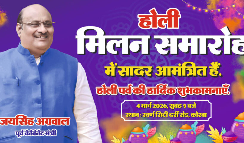 02 March कोरबा: होली के पावन एवं उल्लासपूर्ण पर्व के उपलक्ष्य में दर्री रोड स्थित स्वर्ण सिटी, कोरबा में 4 मार्च 2026, बुधवार को प्रातः…